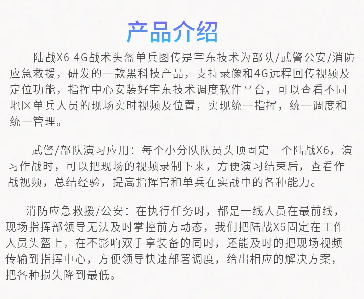 陸戰X6 4G戰術頭盔單兵無線圖傳,可以為應急通信應用提供事發現場的視頻通信指揮調度功能,實現應急現場與后方本部的視頻通信,有效地滿足出現突發性、群體性和災難性事件時的應急指揮調度需要。
